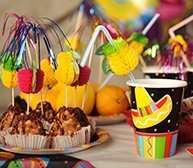 Красочные тарелки, миски, стаканчики и салфетки, а также барные аксессуары с фруктами понадобятся для сервировки.